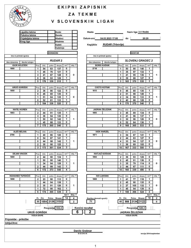 Ekipa Fužinarja je doma gostila ekipo KK Ruše in izgubila 3-5. Najboljši je z 619 podrtimi keglji bil Marko Golob.