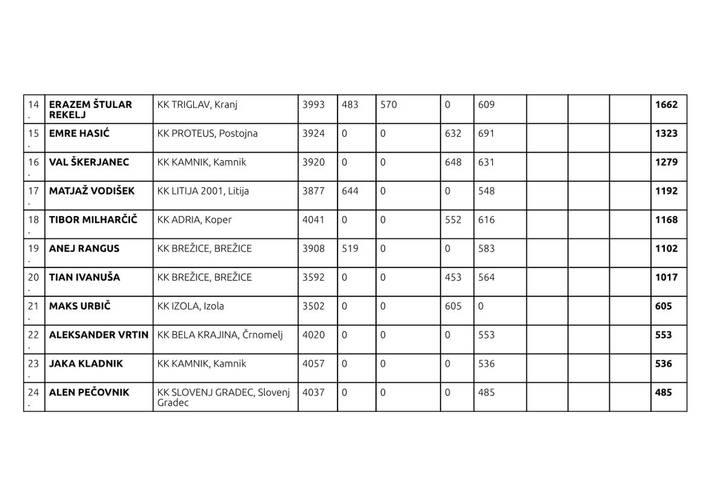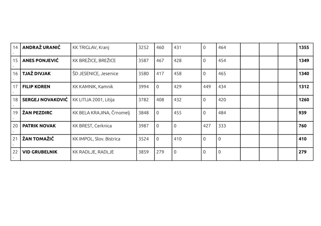 In zadnji od naših nastopajočih, Žan Kresnik. Danes ni bil njegov najboljši rezultat, 656 podrtih kegljev, 83 podrtih kegljev na polno povprečno na 15 lučajev kar ni malo za fanta ki keglja z najmanjšimi kroglami, premera 14 cm. Obdržal je svojo pozicijo na 1. mestu za 116 kegljev prednosti pred drugo uvrščenim za njim kar bi moralo zadostovat za uvrstitev med prve tri, upamo pa da za prvo mesto. Potrebno bo delat na izboljšanju lučaja, ki mu dela preglavice. Upam da bo sam uvidel da se napake dajo odpravit če se jih loti pravilno, brez jeze in upoštevajoč dobronamernih inštrukcij. Čestitke Žan.