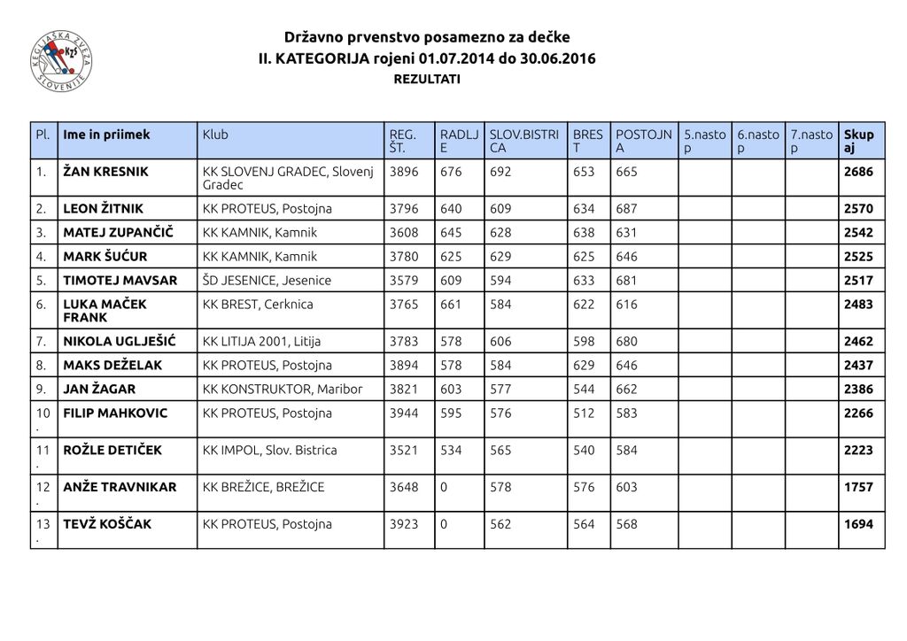 V 2. kategoriji dečkov se odigra 120 lučajev na polno. S svojim prvim nastopom v tej kategoriji se je tekmovanja udeležil Alen Pečovnik. V štirih nastopih do konca sezone ne more osvojit ne vem kakšnega mesta. Zadnji pa vseeno ni. Danes je pokazal da se zna borit, da ga ne zmede slab met ali rezultat. Na treningu se mora osredotočit na kegljanje, kot je to naredil na tekmi in rezultati naslednjo sezono ne bodo izostali. Čestitke Alen, pogumen prvi nastop.
