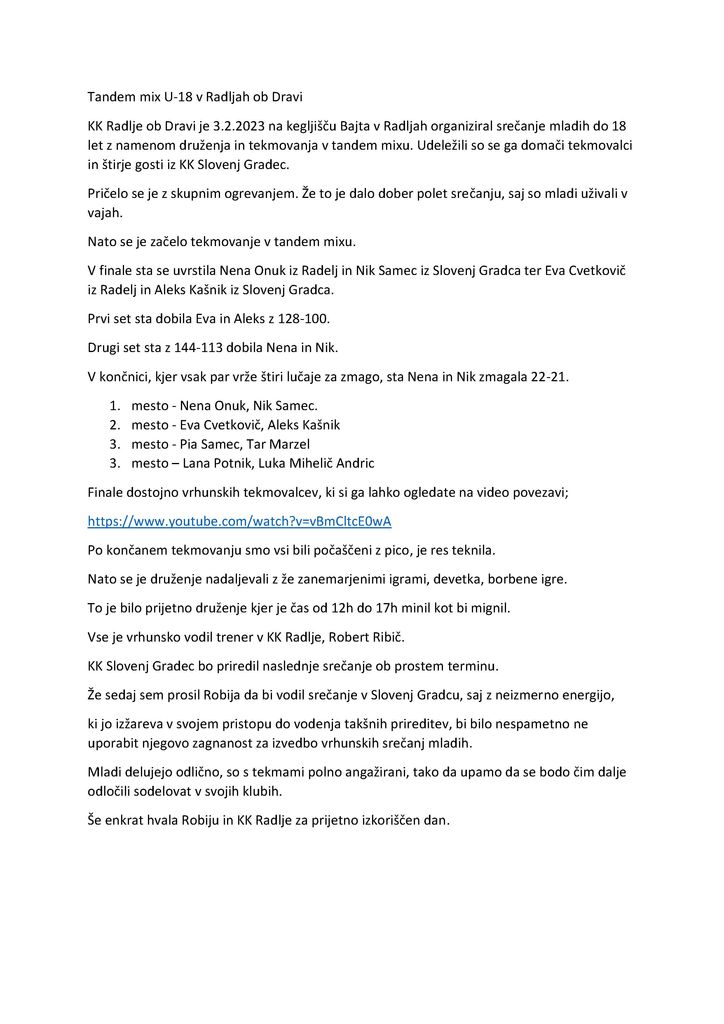 KK Radlje ob Dravi je 3.2.2023 na kegljišču Bajta v Radljah organiziral srečanje mladih do 18 let z namenom druženja in tekmovanja v tandem mixu. Udeležili so se ga domači tekmovalci in štirje gosti iz KK Slovenj Gradec.
