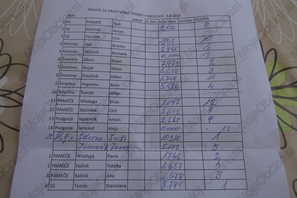Po končanem tekmovanju je sledilo tehtanje rib in razglasitev rezultatov, katere je podal Jože Skaza. Prvi trije tekmovalci v moški in ženski konkurenci so prejeli pokale, katere sta podelila Stanislava Tamše in Jože Skaza.
