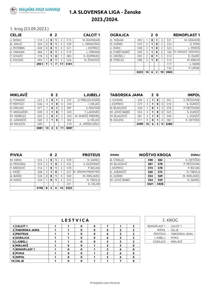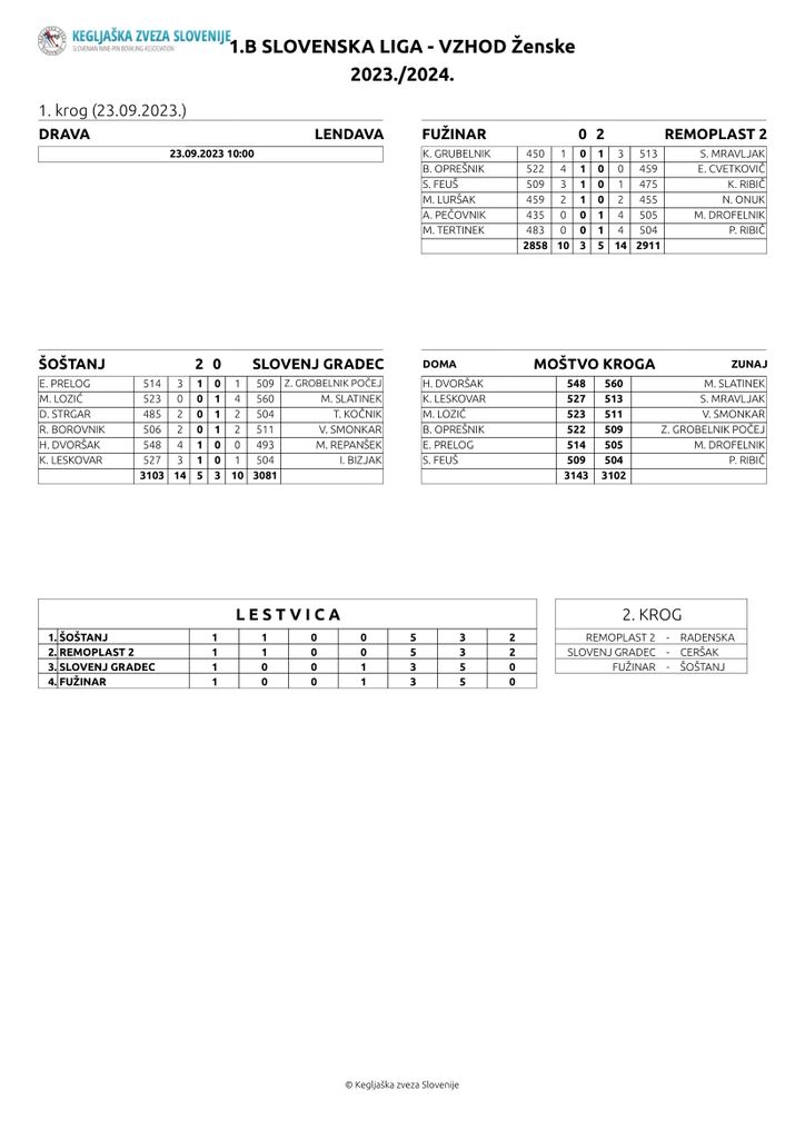 V 1B SLO ligi vzhod za ženske je odigran 1. krog. Ekipa KK Fužinar iz Raven na Koroškem je v koroškem derbiju gostila ekipo Remoplast 2 iz Radelj ob Dravi in izgubila z rezultatom 3-5. Pri domačinkah v Ravnah je najboljši rezultat 522 podrtih kegljev dosegla Blanka Oprešnik, pri gostjah iz Radelj pa Silva Mravljak z 513-mi podrtimi keglji. Ekipa KK Slovenj Gradec je gostovala pri ekipi Šoštanja in izgubila 3-5 proti domačinkam. Najboljši rezultat pri ekipi Slovenj Gradca je dosegla Mojca Slatinek, ki je podrla 560 kegljev. V 1B SLO ligi nastopa 8. ekip. Trenutno je Remoplast 2 na 2. mestu lestvice, Slovenj Gradec na 3. in Fužinar na 4. mestu. Ta vikend so bili odigrane samo tri tekme, en par počiva in bo nastopil naslednji teden, ko bo počival drug par. https://portal.kegljaska-zveza.si/pregled/liga/67