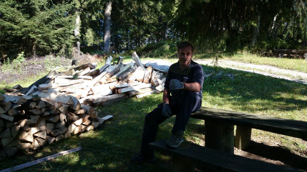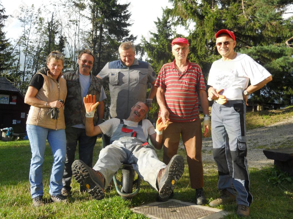 Naš gospodar koče  in neutrudni koordinator  del Stane Plevnik nas je od srede, 27. 8., do petka, 29. 8., razporedil in organiziral tako, da smo v treh skupinah pripravili drva za ogrevanje naše koče in hkrati pospravili nastalo škodo na lesu.