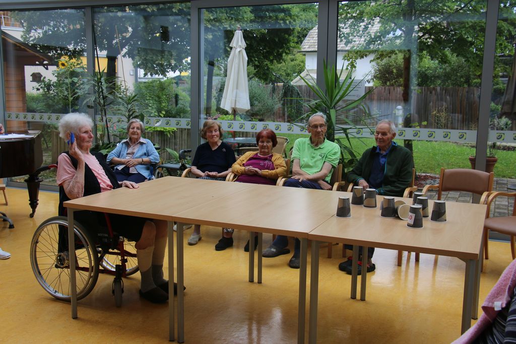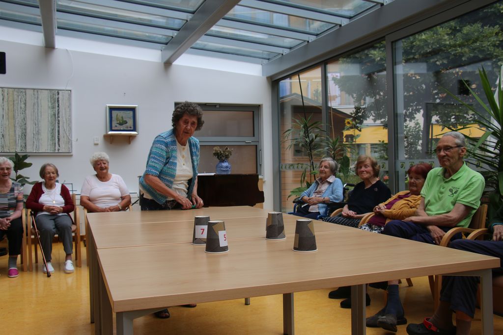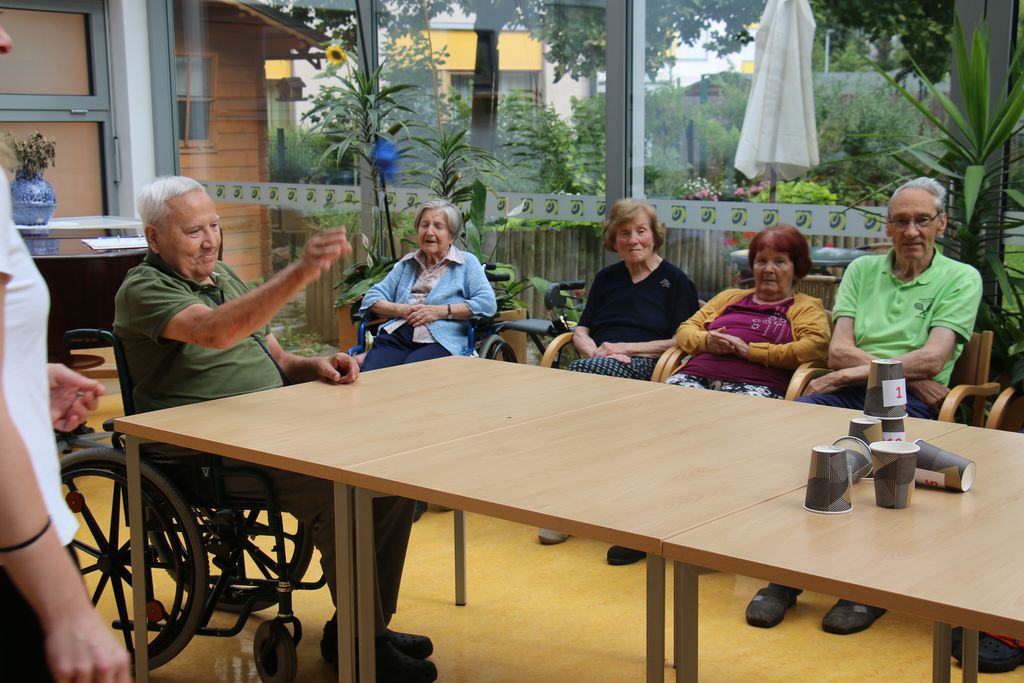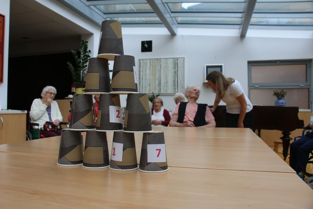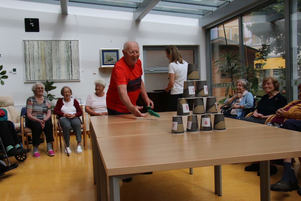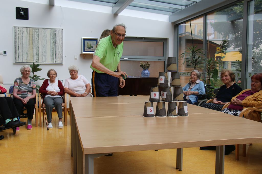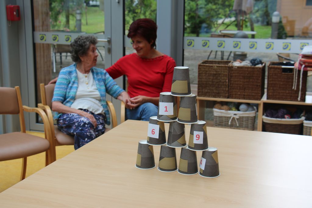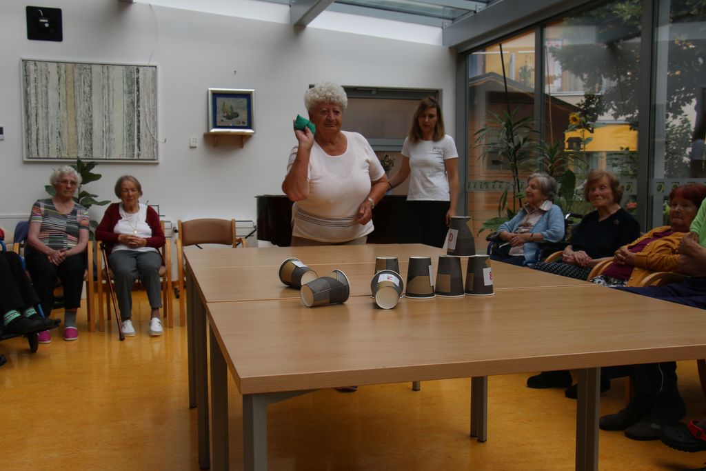 Ob umovadbi je pomembna tudi telesna vadba. Ne zmoti nas niti slabo vreme, saj smo iznajdljivi pri poletnih igrah, imamo jih pač v skupnih prostorih. Tokrat smo ustrezno vešče podirali papirnate kozarce v zimskem vrtu.