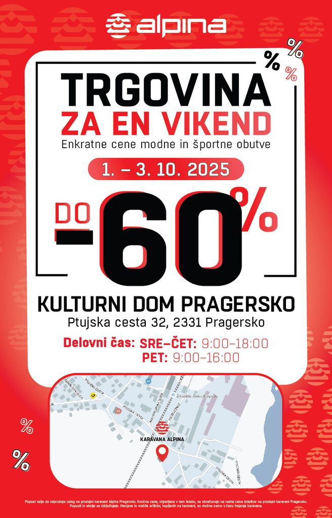 V Kulturnem društvu Pragersko bo od srede, 30. septembra do petka, 3. oktobra 2025, potekala velika odprodaja Alpinine obutve po znižanih cenah – popusti segajo vse do 60%!