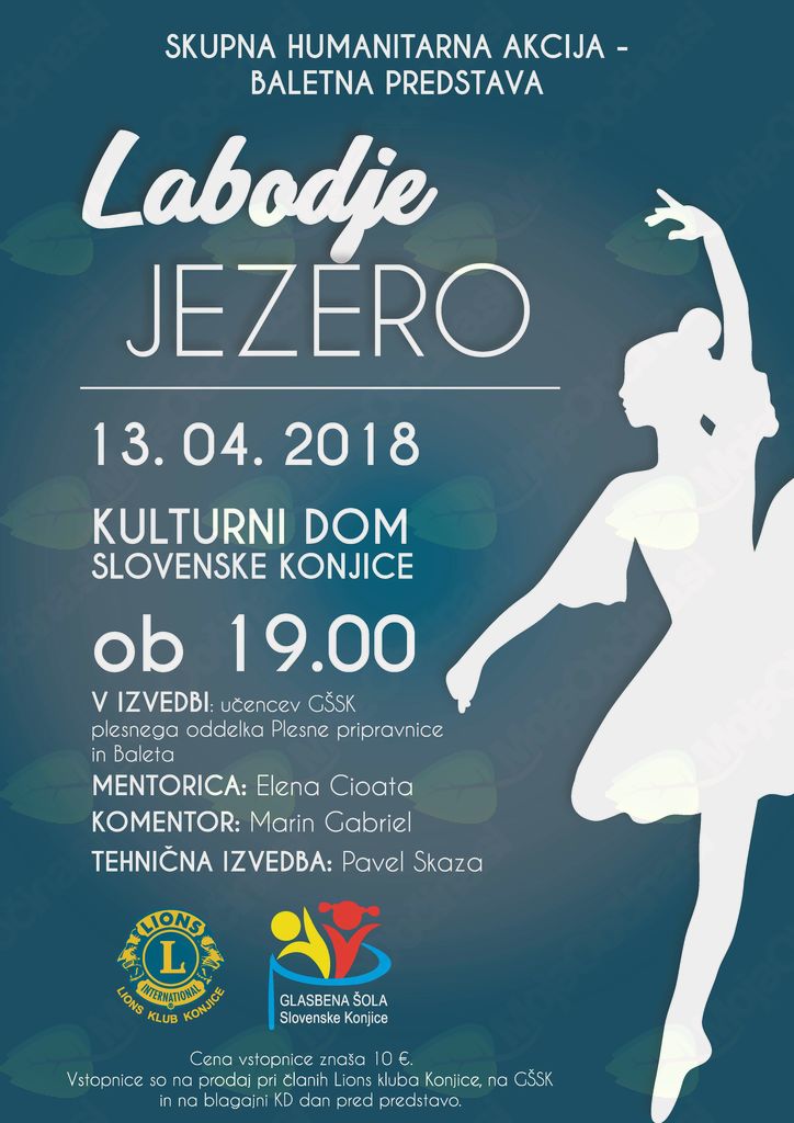 Humanitarno društvo Lions klub Konjice vas v sodelovanju z Glasbeno šolo Sl. Konjice vabi na dobrodelno baletno predstavo Labodje jezero, ki jo bodo v petek, 13. aprila ob 19h v Domu kulture v Sl. Konjicah uprizorili učenci plesnih oddelkov, Baleta in Plesne pripravnice. Vstopnice po €10 so na voljo pri članih Lions kluba Konjice in na Glasbeni šoli Sl. Konjice, na dan predstave pa na blagajni doma. Ves izkupiček bo za humanitarne namene.