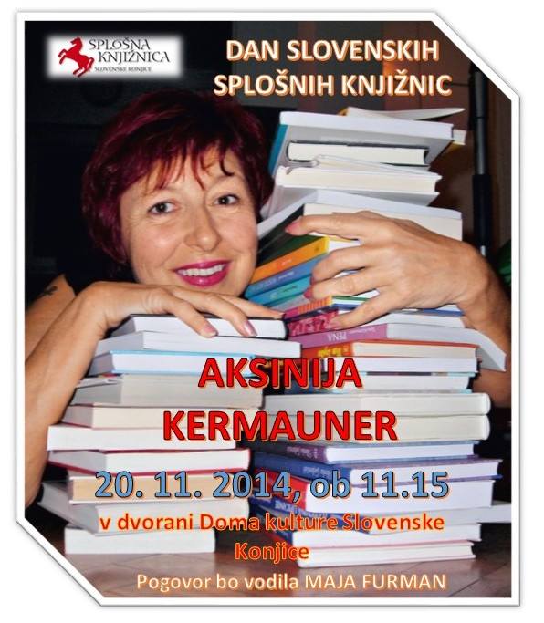 V okviru DNEVA SLOVENSKIH SPLOŠNIH KNJIŽNIC v Splošni knjižnici Slovenske Konjice pripravljamo srečanje s pisateljico Aksinijo Kermauner. Pogovor bo povezovala Maja Furman.