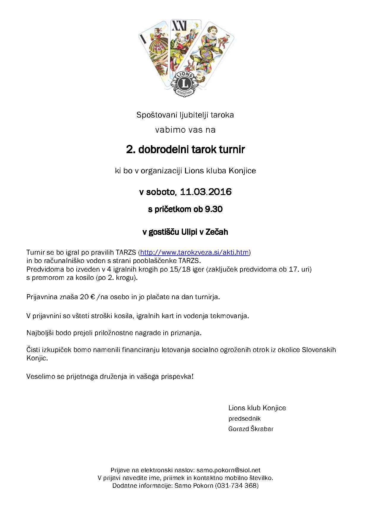 Humanitarno društvo Lions klub Konjice prireja 2. odprti in dobrodelni tarok turnir, ki bo v soboto, 11. marca 2017, s pričetkom ob 9.30 uri v gostišču Ulipi, Zeče 35, p. Sl. Konjice. Humanitarni namen dogodka bo zbiranje sredstev za letovanje socialno ogroženih otrok iz okolice Sl. Konjic.