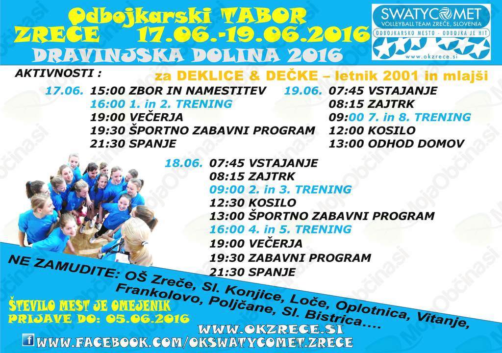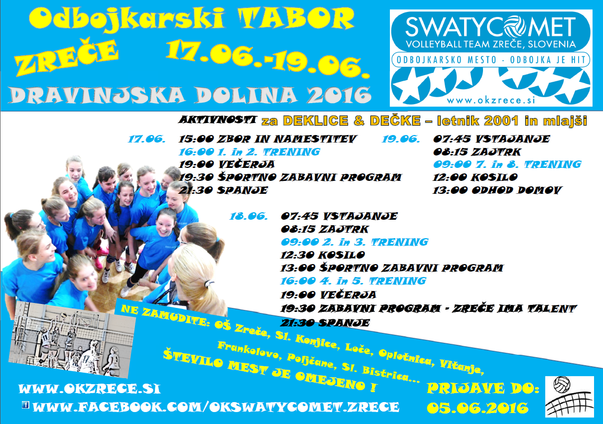 Odbojkarski klub Swatycomet Zreče želi z organizacijo odbojkarskega tabora DRAVINJSKA DOLINA 2016 pokazati skrb in odgovornost do lokalnega okolja, v katerem ne vidimo zgolj priložnost za delovanje. Predvsem osnovnošolkam, tudi popolnim začetnicam, želimo omogočiti druženje ob športu, ki bo na vrhunski in visoki strokovni ravni. Tabor, druženje je namenjeno prvotno osnivnim šolam širše Dravinjske doline. Ne bomo pa izključili nikogar, ki bi se nam pridružil tudi od drugod.