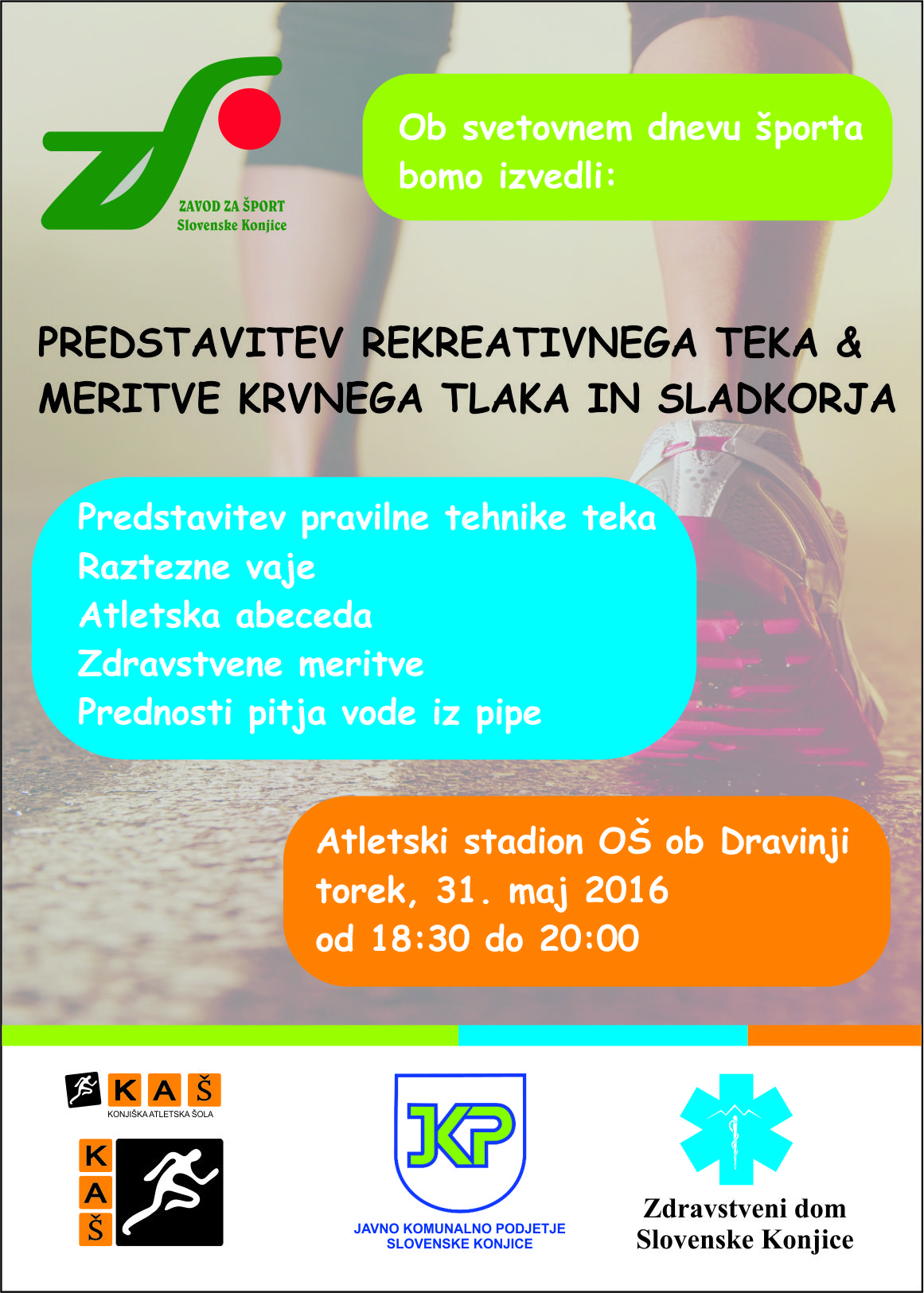 Vabljeni, da se nam ob svetovnem dnevu športa pridružite, ko bomo izvedli PREDSTAVITEV REKREATIVNEGA TEKA & MERITVE KRVNEGA TLAKA IN SLADKORJA.