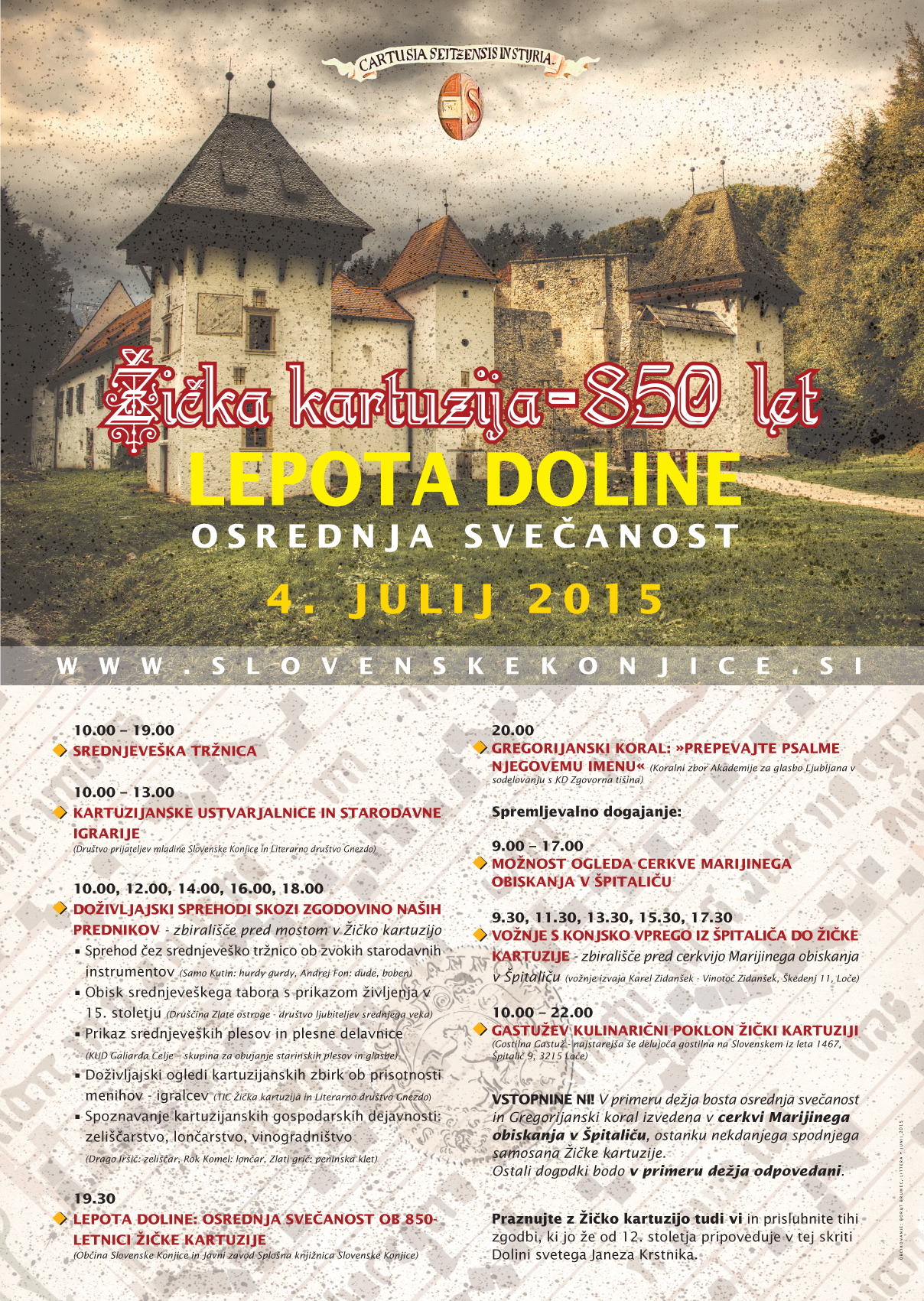 V primeru dežja bosta osrednja svečanost in Gregorijanski koral izvedena v cerkvi Marijinega obiskanja v Špitaliču, ostanku nekdanjega spodnjega samostana Žičke kartuzije. Ostali dogodki bodo v primeru dežja odpovedani.