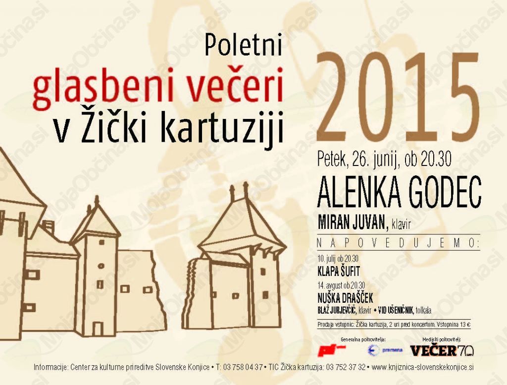 Alenka Godec, izjemna vokalistka, z vrhunsko interpretacijo skladb tako na področju jazza kot popa, bo v Žički kartuziji nastopila ob spremljavi Mirana Juvana, odličnega glasbenika in vsestranskega glasbenega ustvarjalca.