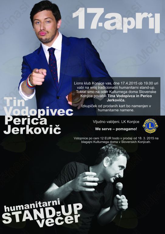 Lions klub Konjice vabi na tradicionalni stand-up večer, ki bo v petek, 17. 4. 2015, ob 19. uri, v Domu kulture Slovenske Konjice. Nastopila bosta Tin Vodopivec in Perica Jerkovič.