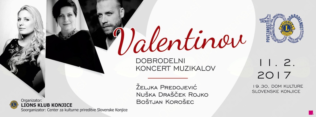 Vabljeni na Valentinov dobrodelni koncert muzikalov 2017 Lions kluba Konjice, na katerem bodo nastopili Željka Predojević, Nuška Drašček Rojko in Boštjan Korošec in katerega izkupiček bomo namenili za pomoč nadarjenim mladim glasbenikom. Prireditev bo v soboto, 11. februarja ob 19.30 uri v Domu kulture v Sl. Konjicah. Vstopnice po €15 so na voljo na blagajni doma.