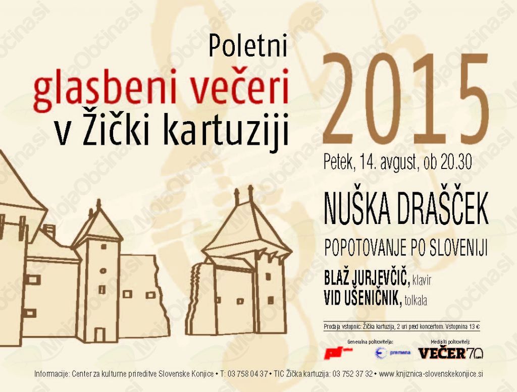 V okviru Poletnih glasbenih večerov v Žički kartuziji bo v petek, 14. avgusta, ob 20:30, nastopila Nuška Drašček. Izvajala bo program, ki ga je poimenovala "POPOTOVANJE PO SLOVENIJI". Gre za znane in manj znane ljudske pesmi in napeve različnih slovenskih pokrajin - od Prekmurja pa vse do Obale. Glasbeniki so pesmi odeli v sveže aranžmaje. S pomočjo odlične in barvite interpretacije Nuške Drašček, pianista Blaža Jurjevčiča in tolkalista Vida Ušeničnika ljudske pesmi zasijejo v povsem novi lepoti. Med drugim lahko prisluhnemo znanim pesmim kot so Zrejlo je žito, San se šetao, Nocoj, pa oh nocoj, Tam, kjer teče bistra Zila, Sovdaška ter manj znanim ljudskim pesmim kot so Od Ribnice do Rakitnice, Zdravička ali Na Gorenščam je fletno.