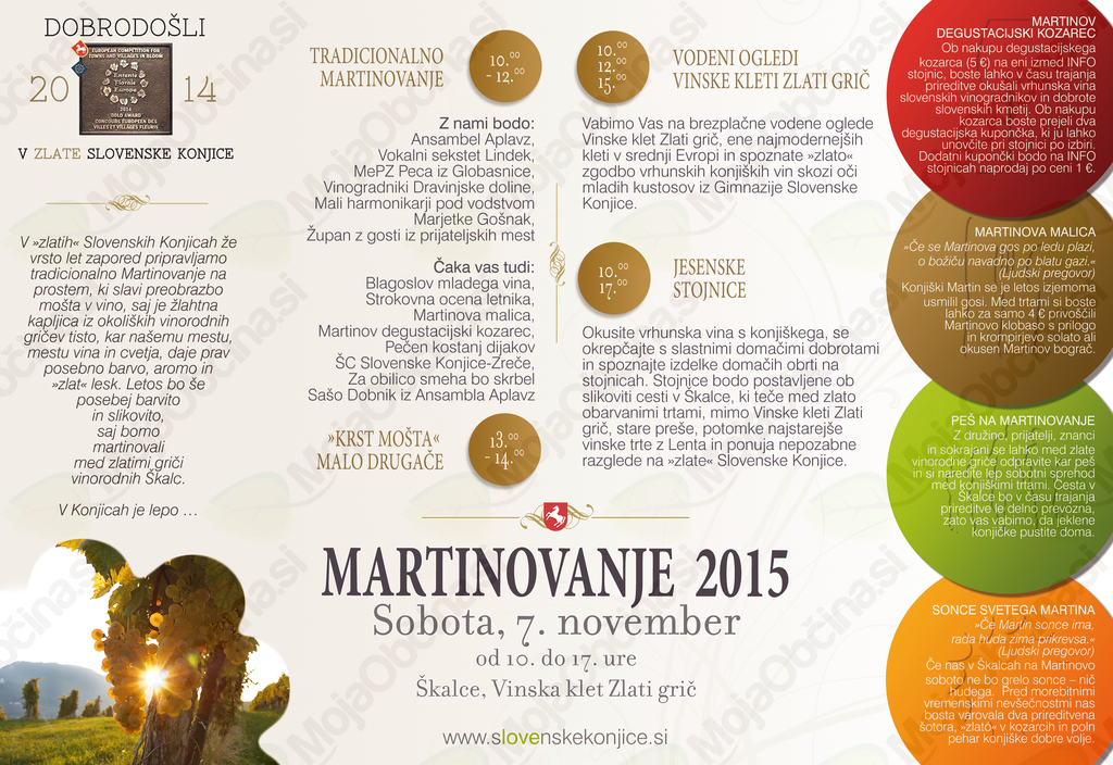 V »zlatih« Slovenskih Konjicah že vrsto let zapored pripravljamo tradicionalno Martinovanje na prostem, ki slavi preobrazbo mošta v vino, saj je žlahtna kapljica iz okoliških vinorodnih gričev tisto, kar našemu mestu, mestu vina in cvetja, daje prav posebno barvo, aromo in »zlat« lesk. Letos bo še posebej barvito in slikovito, saj bomo martinovali med zlatimi griči vinorodnih Škalc. Vabimo Vas, da se nam pridružite!