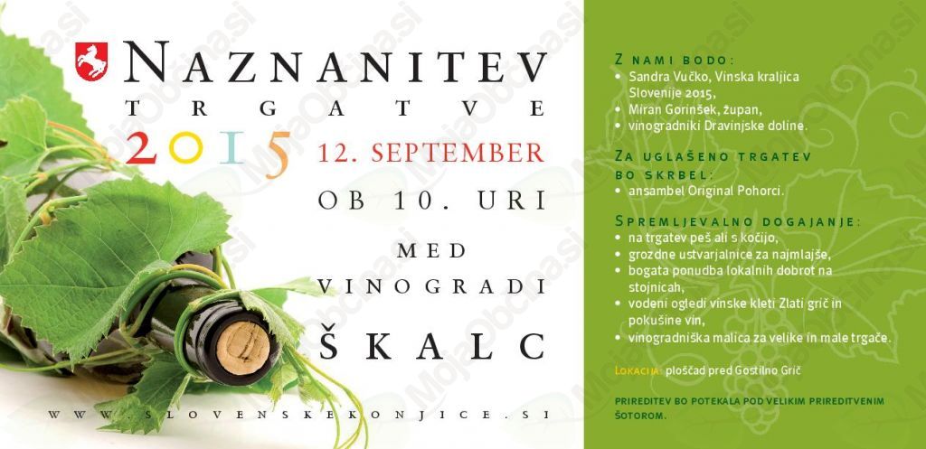 Tradicionalna septembrska prireditev se tokrat iz centra mesta seli med trte vinorodnih Škalc. Vabimo vas na sprehod med zlate vinograde Škalc, kjer bomo po starih običajih naznanili pričetek trgatve v naših vinogradih, v dobri družbi premierno obrali nekaj vrst in se ob domači glasbi razvajali s pristnimi okusi lokalnih vin in dobrot domačih gospodinj. Pridružite se nam na vrhu zlatih gričev vinorodnih Škalc, da skupaj napovemo Trgatev 2015.