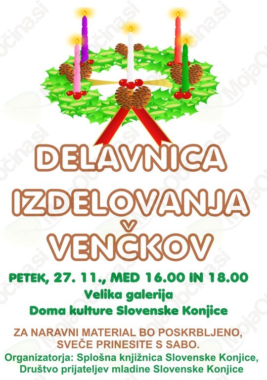 V petek, 27. 11. 2015 med 16.00 in 18.00 tradicionalna delavnica venčkov v Domu kulture Slovenske Konjice.