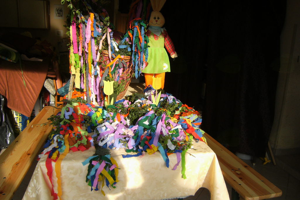 Priprave so potekale že pred srečanjem z nabiranjem  vejic  pušpana, vrbe give, drena in leske, ki ne smejo manjkati v butari. Tudi za pisanost  butaric so poskrbeli z barvnim papirjem.  Med izdelavo so se malo pošalili, pogovorili o lepotah življenja in roke so kar same prepletale vejice ter pisane trakove. Pri delu jih je vspodbujal tudi velikonočni zajček. Na koncu se kar niso mogli odločiti katera je najlepša. Pa saj to tudi ni bilo potrebno. Pomembno je bilo prijetno druženje in  klepetanje.  Seveda so jih na cvetno nedeljo tudi odnesli v cerkev na blagoslov.
