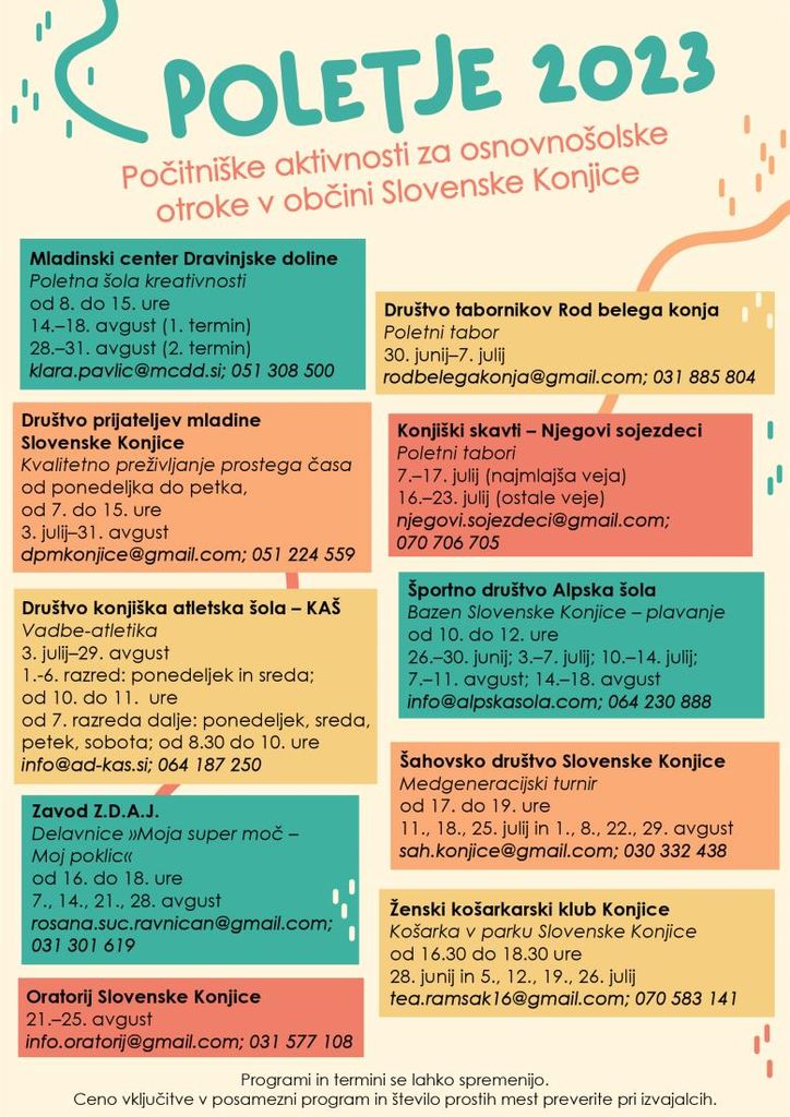 Kakovostno preživljanje počitniškega prostega časa bodo letos otrokom ponudili MCDD, Društvo tabornikov Rod Belega konja, Konjiški skavti – Njegovi sojezdeci, Društvo prijateljev mladine Slovenske Konjice, Društvo Konjiška atletska šola, Športno društvo Alpska šola, Šahovsko društvo Slovenske Konjice, Ženski košarkarski klub Konjice, Zavod Z.D.A.J. in animatorji Oratorija.