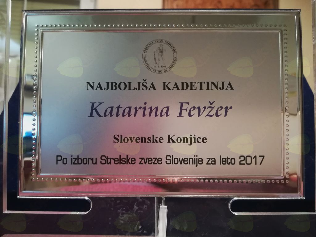 Članica SD Slovenske Konjice, Katarina Fevžer, ima za sabo odlično sezono, v kateri je osvojila dvojni naslov državne podprvakinje z malokalibrsko puško leže in v trojnem položaju. Zelo izstopajoči pa so tudi njeni trije državni kadetski rekordi z malokalibrsko puško. Zraven tega pa je osvojila še srebrno odličje v skupnem seštevku državne kadetske lige s puško. Katarina Fevžer je prvič osvojila laskavi naslov najboljše strelke leta, kar je lepo priznanje za številne ure strelskega treninga, ki jih opravi.