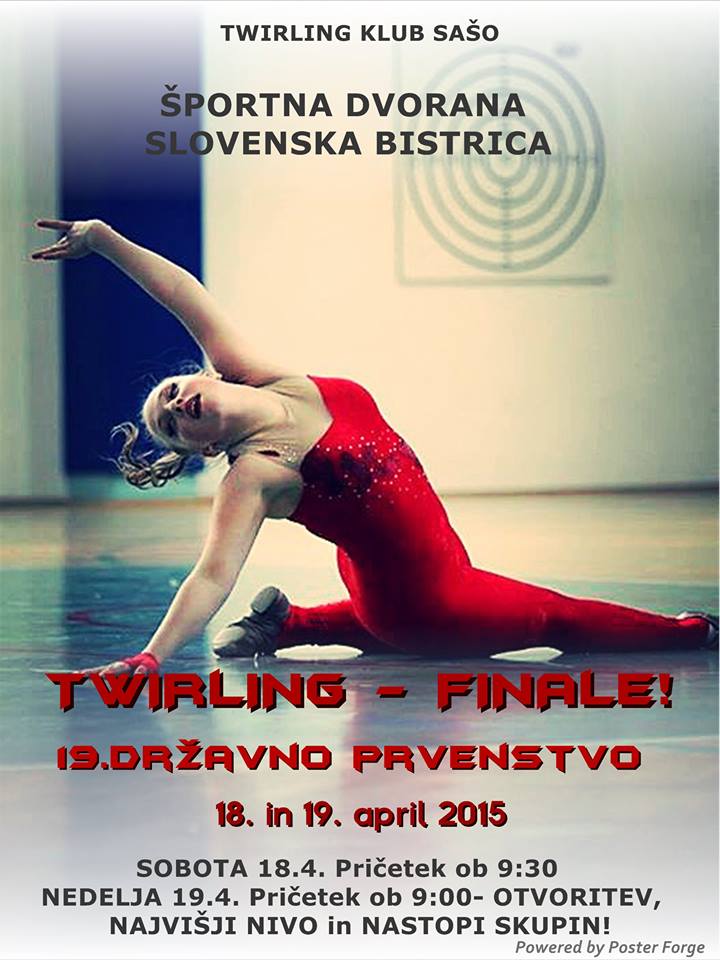 Organizator letošnjega finalnega tekmovanja je Twirling klub Sašo iz Slovenske Bistrice. V soboto, 18. 4. 2015, se tekmovanje začne ob 9.30 uri z nastopi novincev, ter nadaljuje s finalnimi nastopi posameznikov in parov v solo in freestyle disciplini. V nedeljo se tekmovanje prične s slavnostno otvoritvijo ob 9. uri. Nato boste lahko spremljali najboljše nastope posameznikov in parov v najzatevnejših kategoriah, ter na koncu še skupine.