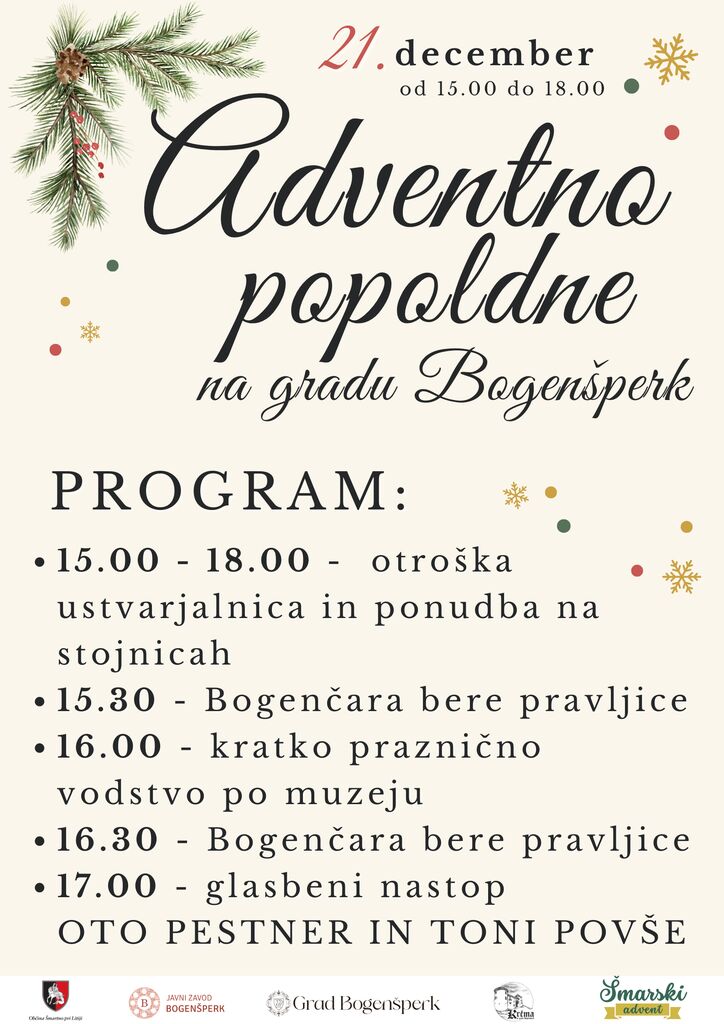 Vabljeni to nedeljo, 21. decembra 2025, na čarobno adventno popoldne na grad Bogenšperk. P r o g r a m:15.00 - 18.00: otroška ustvarjalnica in ponudba na stojnicah.15.30 - pravljica (bere jo čarovnica Bogenčara)16.00 - kratko vodstvo po muzeju,16.30 - pravljica (bere jo čarovnica Bogenčara) 17.00 - adventno popoldne bo sklenil glasbeni nastop Ota Pestnerja in Tonija Povšeta. Na grad bo s postajališča pod dvorano Pungrt v Šmartnem pri Litiji vozil tudi minibus (ob 14.20, 15.40 in po dogovoru).Vstop je prost. Lepo povabljeni.