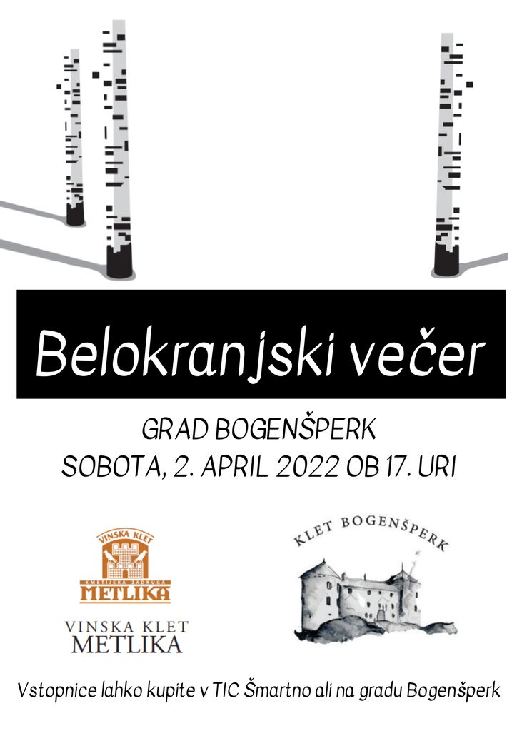 Veseli smo, da vam lahko predstavimo poseben tematski dogodek, ki ga na gradu Bogenšperk pripravljamo s partnerjema vinske kleti na gradu, Vinsko kletjo Metlika in Krčmo na gradu Bogenšperk. Belokranjski večer je sestavljen iz dveh sklopov, in sicer se lahko odločite za 6-hodni meni z vinsko spremljavo Vinske kleti Metlika v krčmi ali za posebno belokranjsko degustacijo vina s prigrizki v naši kleti.