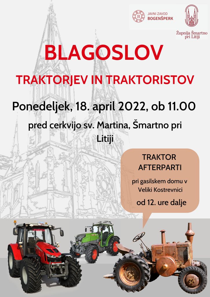 Na velikonočni ponedeljek, 18. 4. 2022, bo ob 11. uri pred cerkvijo sv. Martina v Šmartnem potekal že tradicionalni Blagoslov traktorjev in traktoristov.