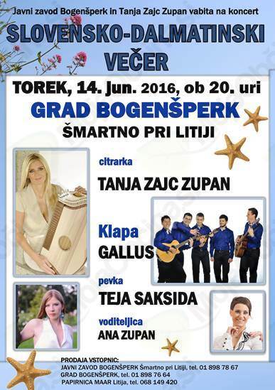 Javni zavod Bogenšperk in Tanja Zajc Zupan vabita na koncert slovensko-dalmatinski večer, ki bo zaradi predvidene slabe vremenske napovedi potekal v Kulturnem domu Šmartno v torek, 14. junija 2016, ob 20. uri.