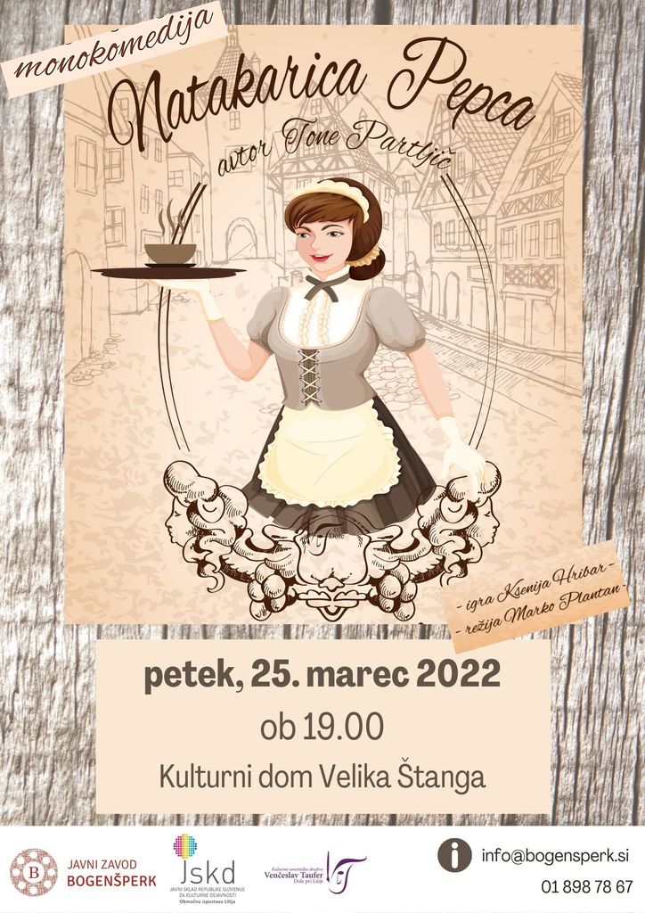 V petek, 25. marca 2022, vas ob 19. uri vabimo v Kulturni dom v Štangi na monokomedijo "Natakarica Pepca".
