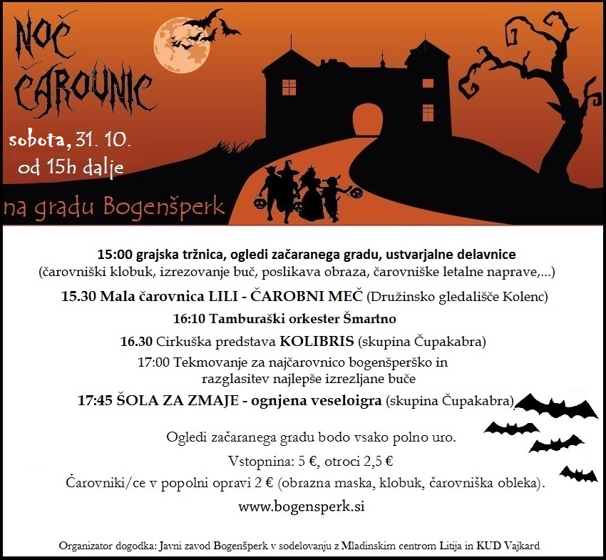 Ko se bo noč spustila na grad, boste čarovnice lahko pokazale svoje veščine in izbrale 'naj čarovnico bogenšperško', razglasili bomo najlepše izrezljano bučo. Za staro in mlado bo Družinsko gledališče Kolenc odigralo predstavo Mala čarovnica Lili in čarobni meč, zabavali nas bodo cirkusanti iz skupine Čupakabra, za konec pa nas bo osupnil še ognjeni spektakel z naslovom Šola za zmaje. Pestrost večera bodo dopolnili domači tamburaši in ponudniki domače in umetnostne obrti ter kulinaričnih in zeliščarskih posebnosti območja ob gradu.