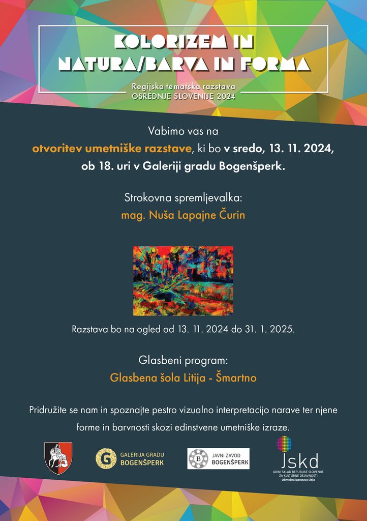 V sklopu Šmartnovanja 2024 vas Občina Šmartno pri Litiji v sodelovanju z Javnim zavodom Bogenšperk in JSKD OI Litija vabi na odprtje regijske umetniške razstave z naslovom "Kolorizem in natura / barva in forma.
