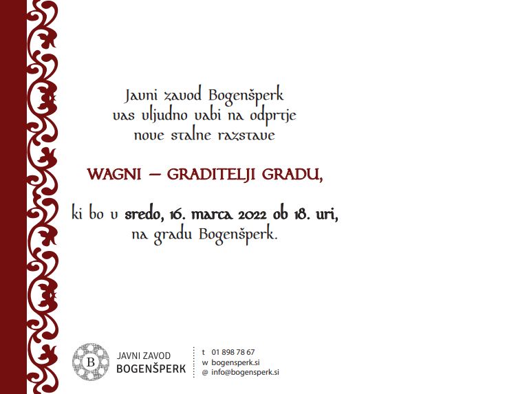 Javni zavod Bogenšperk vas vljudno vabi na odprtje nove stalne razstave WAGNI – GRADITELJI GRADU, ki bo v sredo, 16. marca 2022 ob 18. uri, na gradu Bogenšperk.