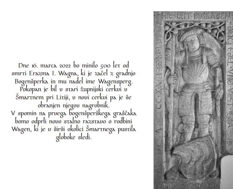 Dne 16. marca 2022 bo minilo 500 let od smrti Erazma I. Wagna, ki je začel z gradnjo Bogenšperka in mu nadel ime Wagensperg. Pokopan je bil v stari župnijski cerkvi v Šmartnem pri Litiji, v novi cerkvi pa je še ohranjen njegov nagrobnik. V spomin na prvega bogenšperškega graščaka bomo odprli novo stalno razstavo o rodbini Wagen, ki je v širši okolici Šmartnega pustila globoke sledi.
