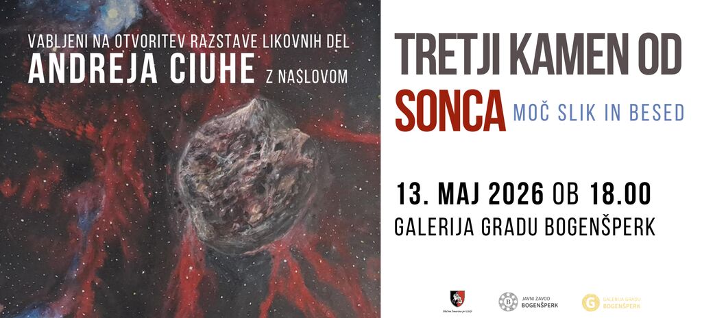 Vabljeni na otvoritev likovne razstave Andreja Ciuhe z naslovom Tretji kamen od sonce (Moč slik in besed) v sredo, 13. maja 2026 ob 18.00 v Galeriji gradu Bogenšperk.