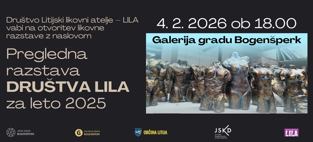 Člani Društva Litijski likovni atelje - LILA se na pregledni letni razstavi predstavljajo s slikami, malo plastiko (kipi - ženski in moški torzo) in fotografijami. Njihova dela so nastala v letu 2025 na tedenskih likovnih delavnicah pod mentorstvom mag. Zorana Pozniča, akad. kiparja, na fotografski delavnici pod mentorstvom Andreje Ravnak na gradu Bogenšperk, v okviru natečaja JSKD in Extempora Lila 2025 ter samostojno. Naj Vas popeljejo v svet čutnih doživetij.