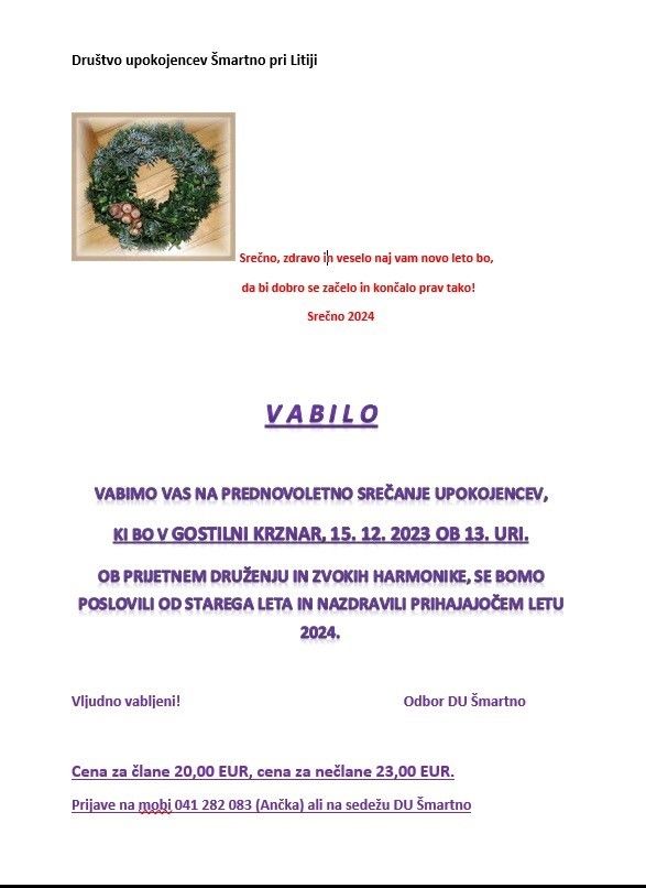 Prijave sprejemamo v društveni pisarni v sredo 6.12.2023 in 13.12.2023 9-11h.