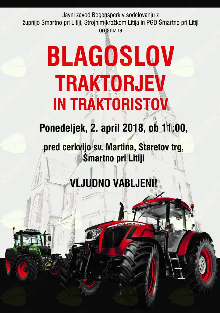 Javni zavod Bogenšperk v sodelovanju z župnijo Šmartno pri Litiji, Strojnim krožkom Litija in PGD Šmartno pri Litiji organizira blagoslov traktorjev in traktoristov.