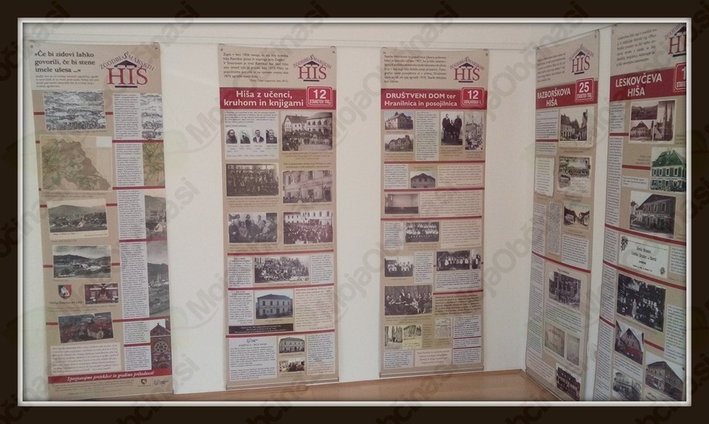Pozornost prisotnih se je nato osredotočila na drugo stran galerije, kjer pa svojo zgodbo pripovedujejo šmarske hiše. Knjižnica Litija se je lotila prav posebnega izziva in projekta, Zgodbe šmarskih hiš, ki je pritegnil tako sodelavke in sodelavce knjižnice, ki so brskali po arhivih, primerjali fotografije, raziskovali v zemljiški knjigi, kot tudi lastnike hiš in številne, ki so želeli deliti svoje zgodbe, saj so si o Šmartnem marsikaj zapomnili ali pa tudi sami doživeli. Poglaviten namen projekta je namreč ohranjati dediščino, na katero se še prehitro pozabi. Panoji z zgodbami šmarskih hiš so na ogled v galeriji krajevne knjižnice Šmartno, projekt pa se bo gotovo slej kot prej nadaljeval, saj še mnoge hiše prišepetavajo, da je potrebno povedati tudi njihovo zgodbo. Ob koncu uradnega dela odprtja razstav je bilo moč prisluhniti pesmi z naslovom Castiliano, ki jo je zaigral Leon Ciglar, prav tako učenec Glasbene šole Litija Šmartno, sledilo pa je prijetno druženje in klepet o obeh razstavah.