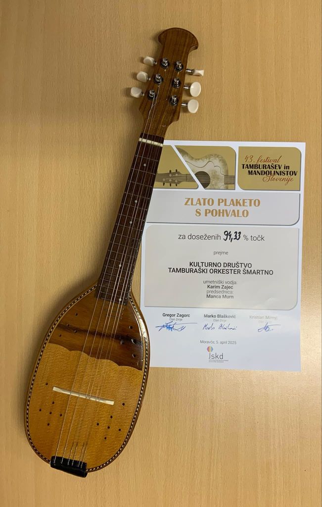 S ponosom sporočamo, da smo si na 43. Festivalu tamburašev in mandolinistov, ki je potekal 5. aprila 2025, priigrali 94,33 % točk in ZLATO PLAKETO S POHVALO ter posebno pohvalo za najboljšo izvedbo obvezne sklade Aldebaran (Helena Vidic Lesjak).