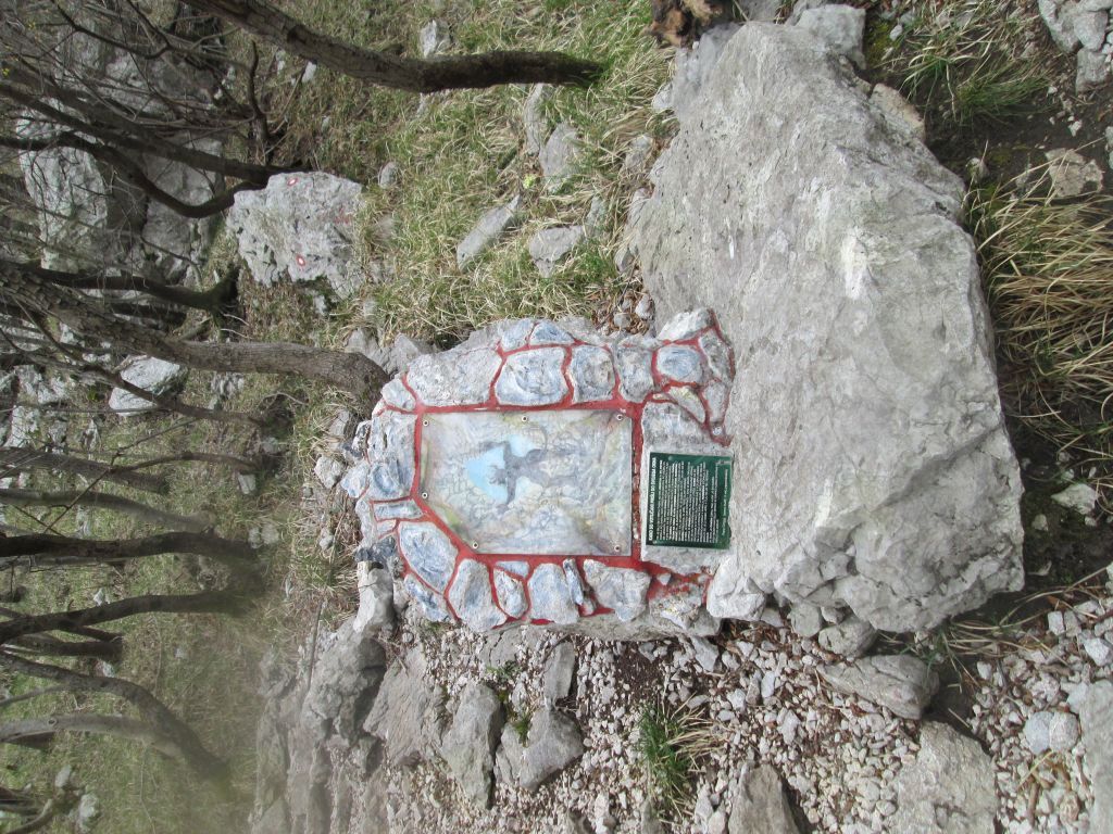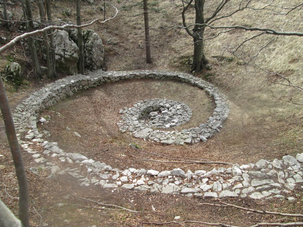 Seveda piha, kot se za kraje, kjer je burja doma, spodobi. V zatišju malicamo-nekateri naši člani povedo, da je to najboljši trenutek pohoda in se odpravimo do stožca in spirale-polža. Zanimivo.