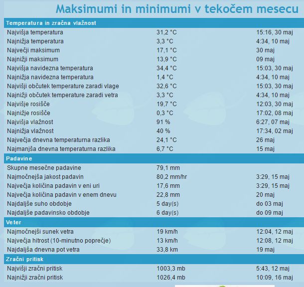 Najvišja dnevna temperatura 31,2° C je bila izmerjena 30. maja ob 15:16. uri, najnižja 3,3° pa 10. maja ob 4:34. uri. Poprečna temperatura v marcu je bila 16,4° C.