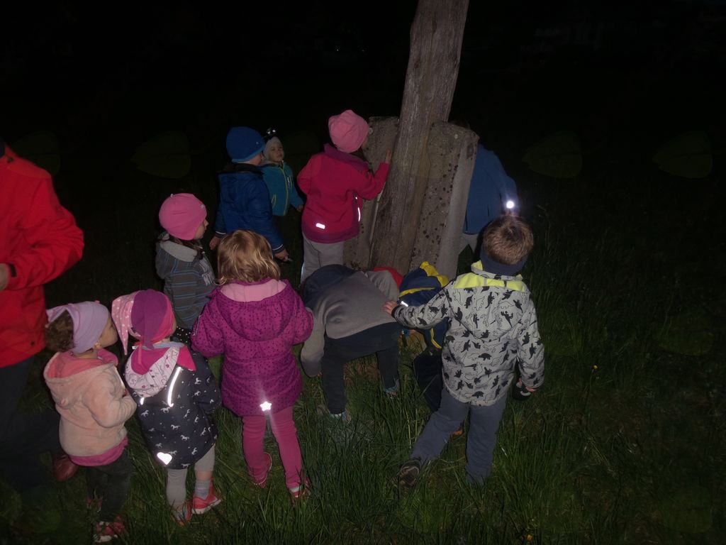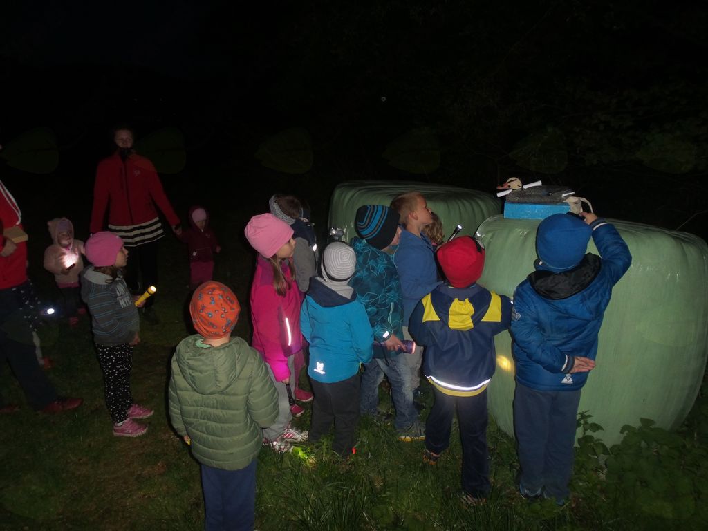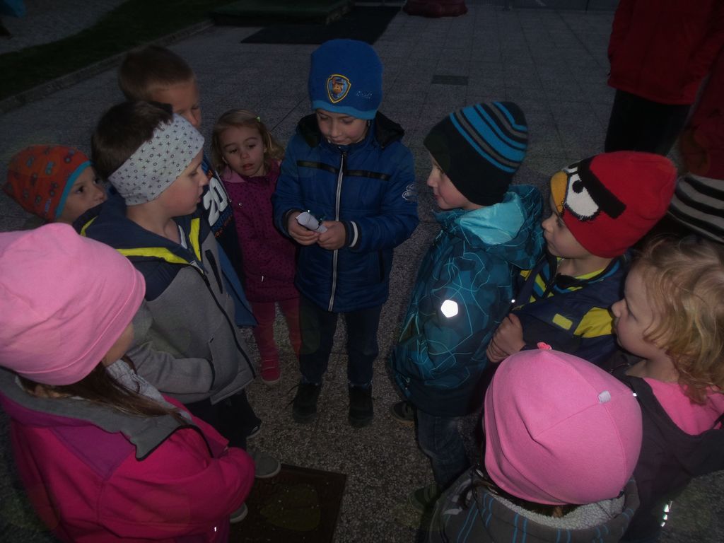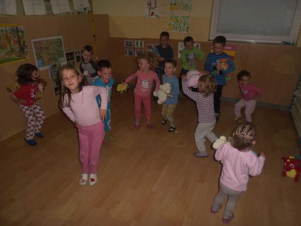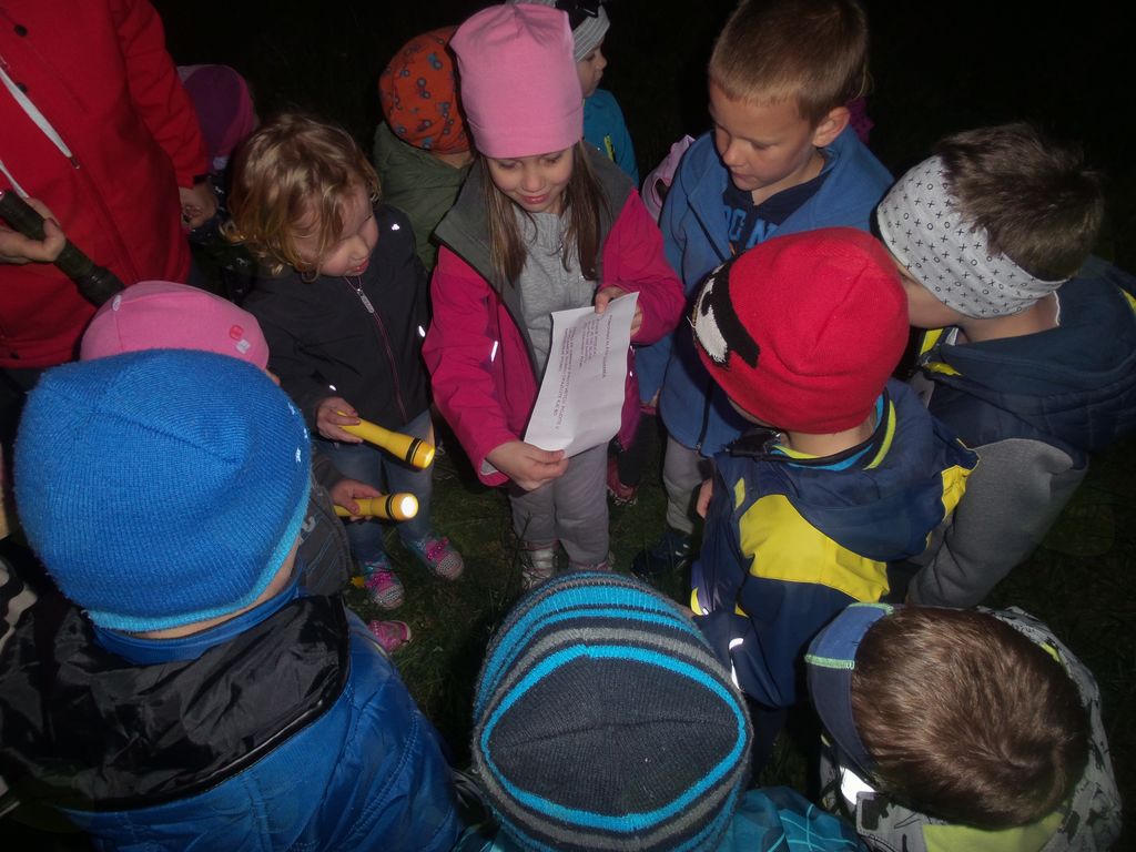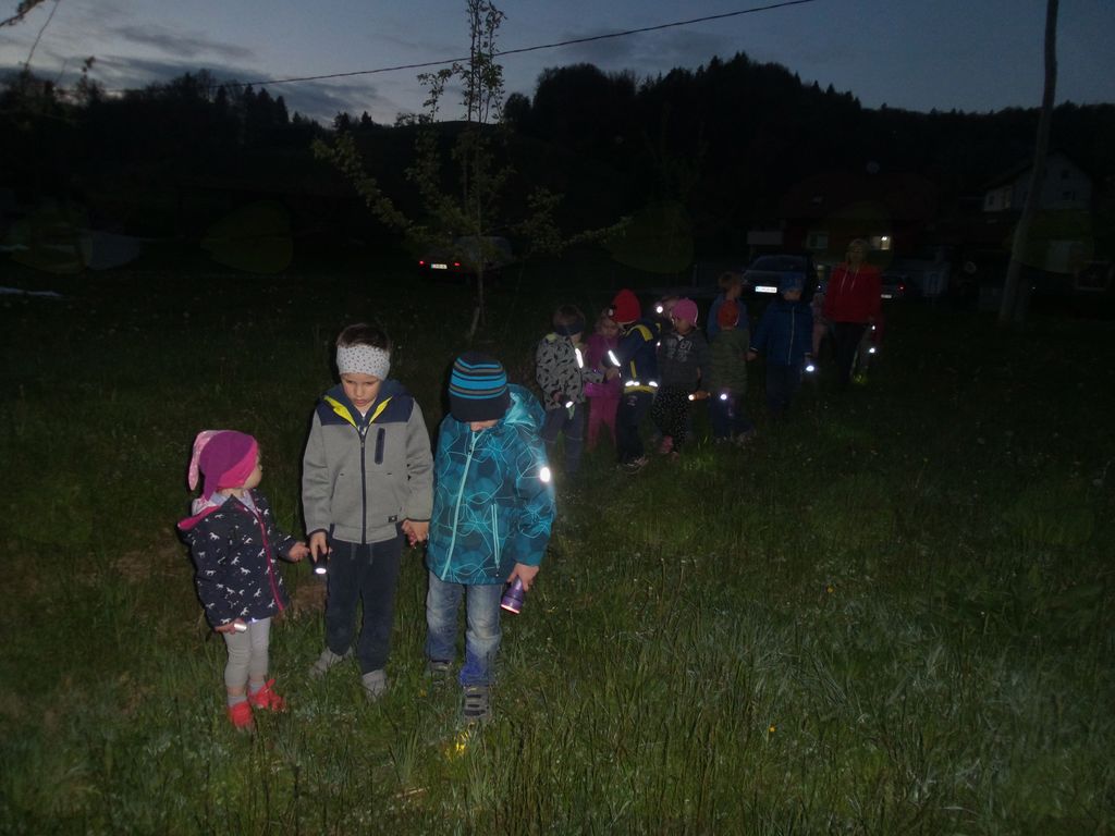 Končno je prišel dan ali bolje rečeno noč, ki so jo otroci celo leto težko čakali. Ob določeni uri smo se ponovno zbrali v vrtcu. Prostor začetnega glavnega dogajanje je bilo igrišče, kjer so se otroci v času prihajanja lahko še igrali. Sledilo je branje pisma, ki nam ga je prinesel polž Vladimir. Zastavil nam je nekaj vprašanj ter napovedal večerjo, ki je vključevala aktivno udeležbo otrok. Na žerjavici, na palicah smo pekli hrenovke. Po okrepčilu smo prebrali drugo pismo Vladimirja, ki nas je usmerilo na iskanje zaklada. Ker se je že mračilo smo si pomagali s svetilkami. Uganke so nas vodile po igišču, do potoka, in ob njem naprej do mesta, kjer nas je čakala račka Bina. Za nas je imela pripravljene dobrote, s katerimi smo se posladkali v vrtcu, nekaj pa smo jih odnesli domov. Polž Vladimir in račka Bina sta nas pospremila nazaj do vrtca, kjer sta nas varovala celo noč. Nato je sledil ples v pižamah, priprava na spanje in spanje. Otroci so mirno prespali noč ter se nasmejani zbudili v nov dan.