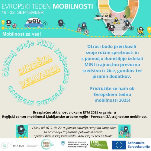 Regijski center mobilnosti Ljubljanske urbane regije (RCM LUR) v okviru Evropskega tedna mobilnosti 2025 - "Mobilnost za vse!" med 16. in 22. septembrom organizira izvedbo različnih brezplačnih aktivnosti v občinah Ljubljanske urbane regije. Preveri, kje se nam lahko pridružiš v tvoji občini!