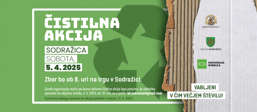 Turistično društvo Sodražica v sodelovanju z Občino Sodražica in Komunalo Ribnica d.o.o. tudi letos organizira čistilno akcijo. Akcija bo v soboto, 5. 4. 2025. Zbor bo kot običajno ob 8. uri na trgu. Udeležba je na lastno odgovornost.