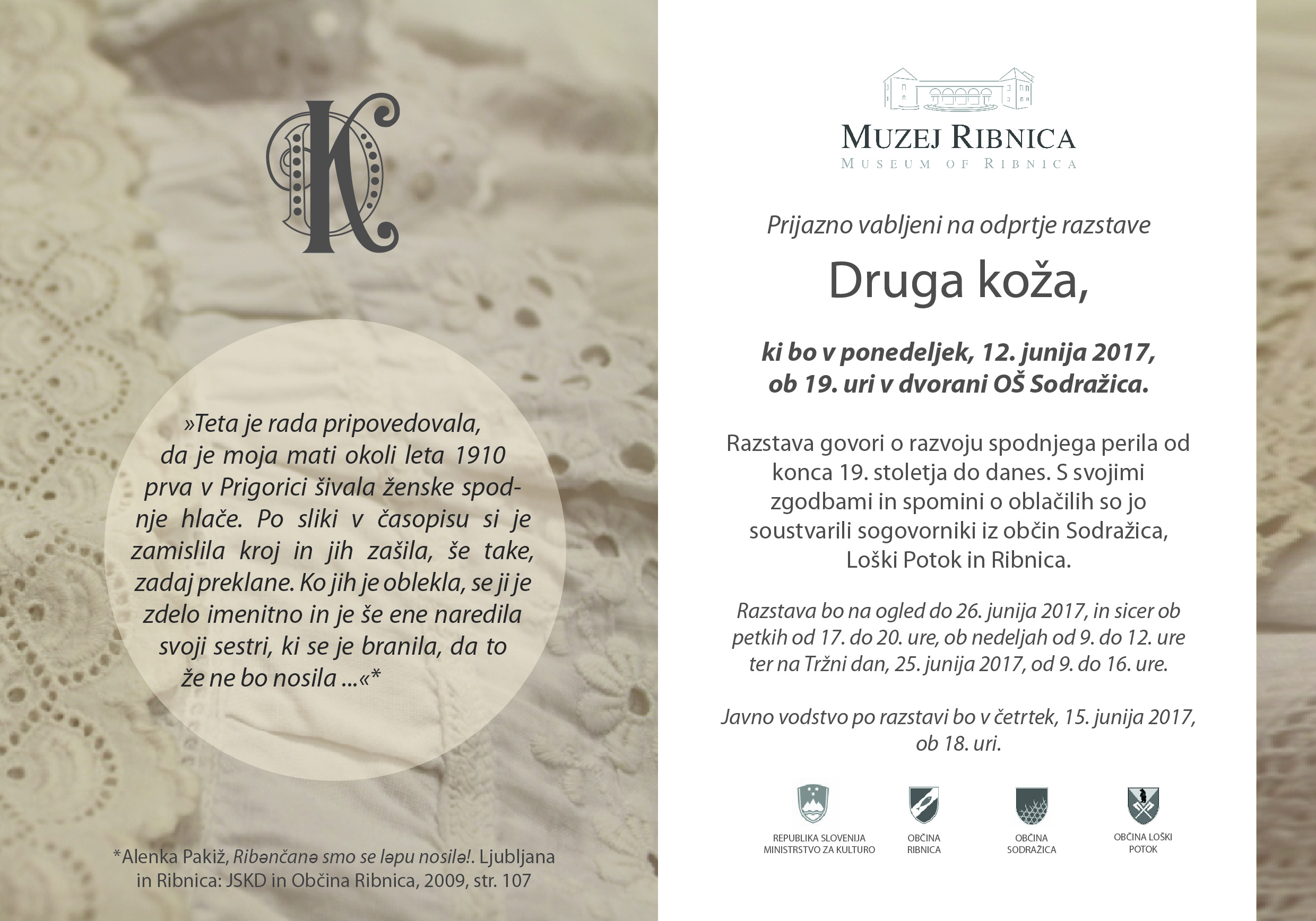 Prijazno vabljeni na odprtje razstave Druga koža, ki bo v ponedeljek, 12. junija 2017, ob 19. uri v dvorani OŠ Sodražica.