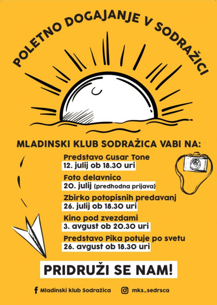 Mladinski klub Sodražica vabi na zabavno animacijsko in prisrčno predstavo za vso družino v izvedbi Družinskega gledališča Kolenc, v petek, 12. 7. 2024, ob 18.30 uri. Predstava bo v Kostanjevem parku oz. v primeru slabega vremena v OŠ Sodražica.