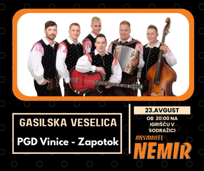 PGD Vinice-Zapotok vabi na veliko gasilsko veselico v čast pridobitvi novega gasilskega vozila GVV-1, ki bo na nogometnem igrišču v Sodražici, v soboto, 23. avgusta s pričetkom ob 18. uri z gasilsko parado in ob 20. uri z zabavo, za katero bo poskrbel Ansambel Nemir