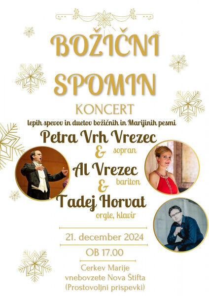 V cerkvi Marije Vnebovzete pri Novi Štifti na Dolenjskem vas le nekaj dni pred Božičem, 21. decembra ob 17.00, vabimo na božični koncert z lepimi spevi in dueti božičnih in Marijinih pesmi. Prepevala bosta sopranistka Petra Vrh Vrezec in baritonist Al Vrezec. Za klavirjem in orglami ju bo spremljal Tadej Horvat. Srčno vabljeni na predbožično praznovanje!
